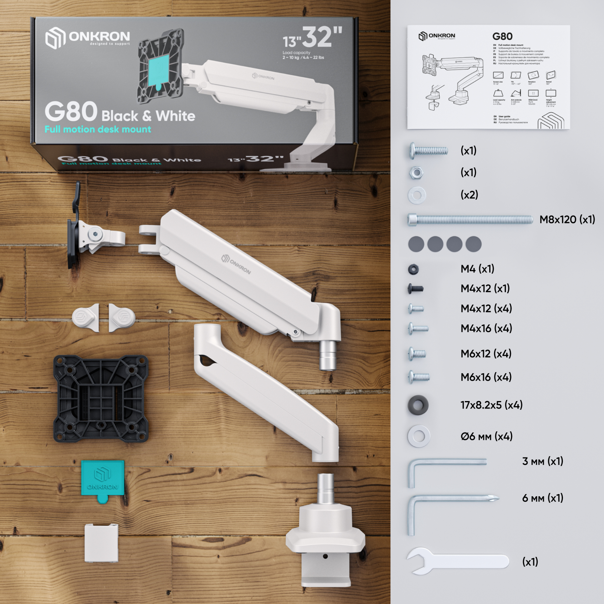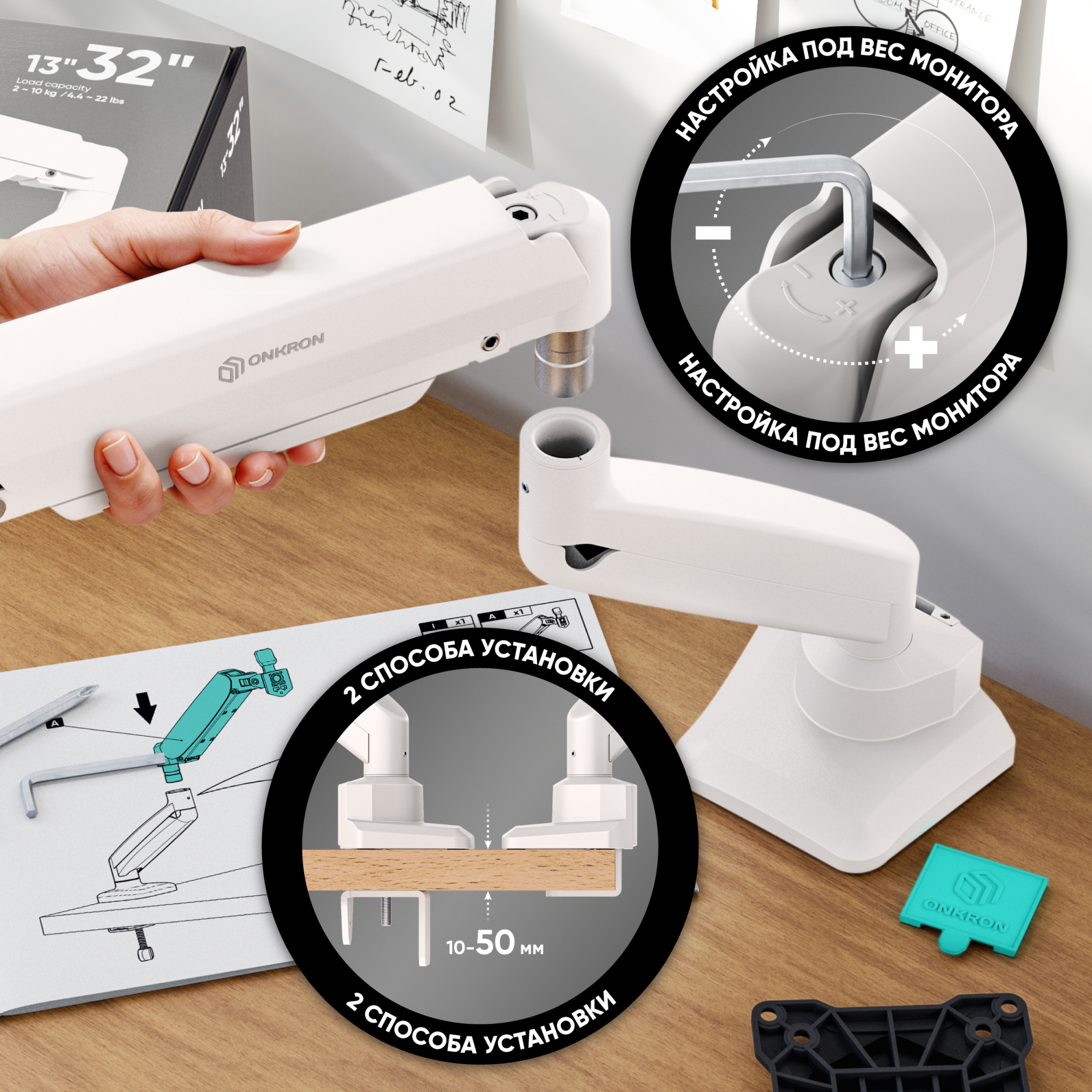 | Для экранов диагональю 13"-32" Допустимая нагрузка: 2 - 10 кг VESA: 75x75, 100x100 мм Угол наклона: -45° ~ +90° Угол поворота: 180° Угол вращения VESA: 360° Вылет от основания: 508 мм Вертикальное перемещение: 181-436 мм Цвет - черно-белый Портретная/альбомная ориентация экрана Установка на край стола или через отверстие в столешнице Материалы: сталь, алюминий, пластик |