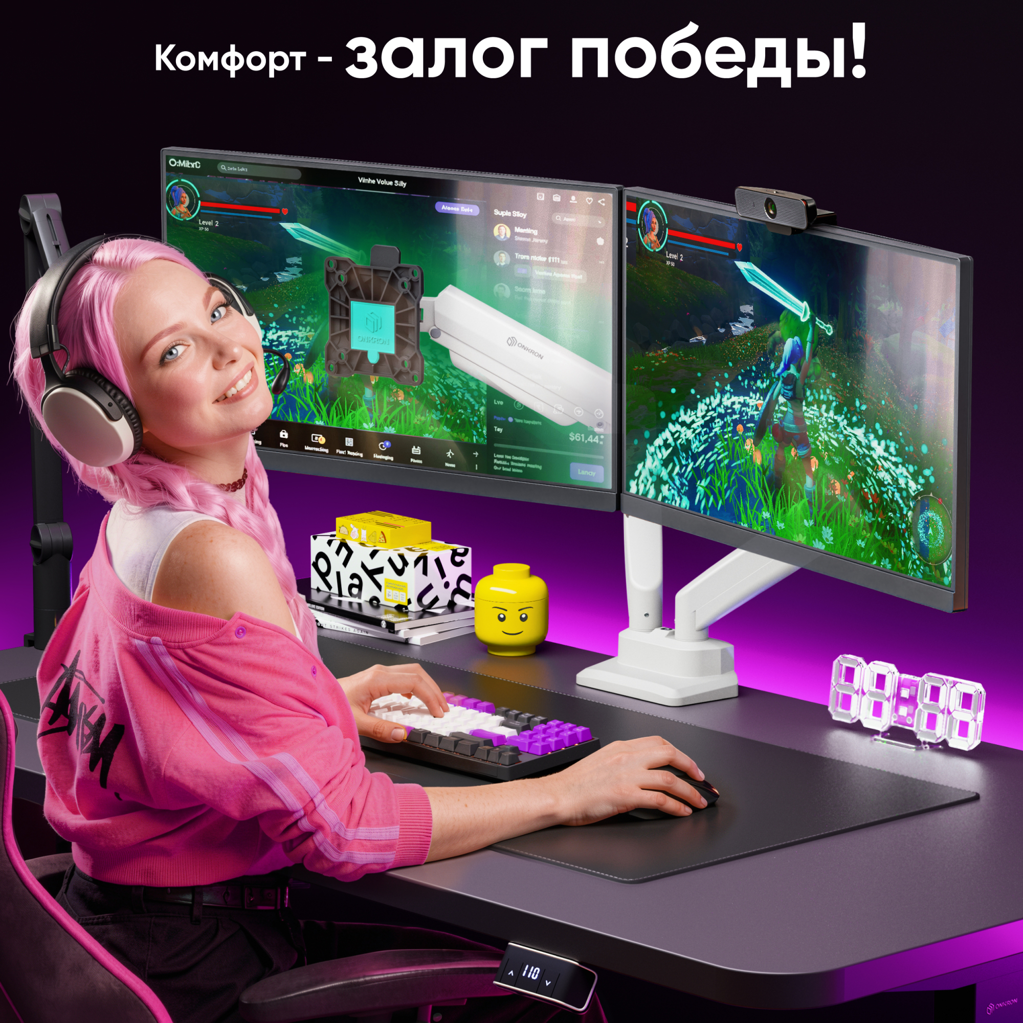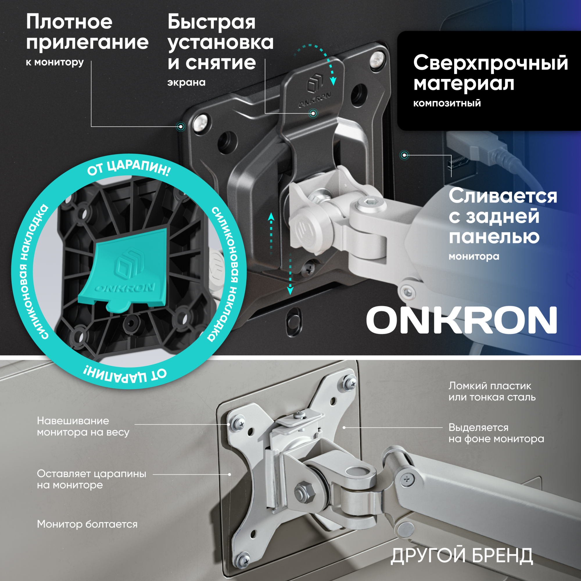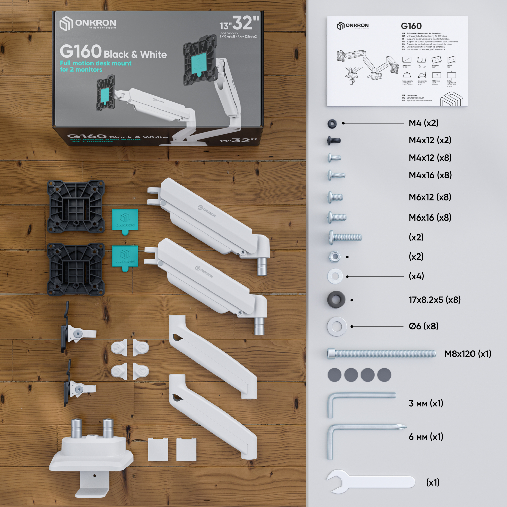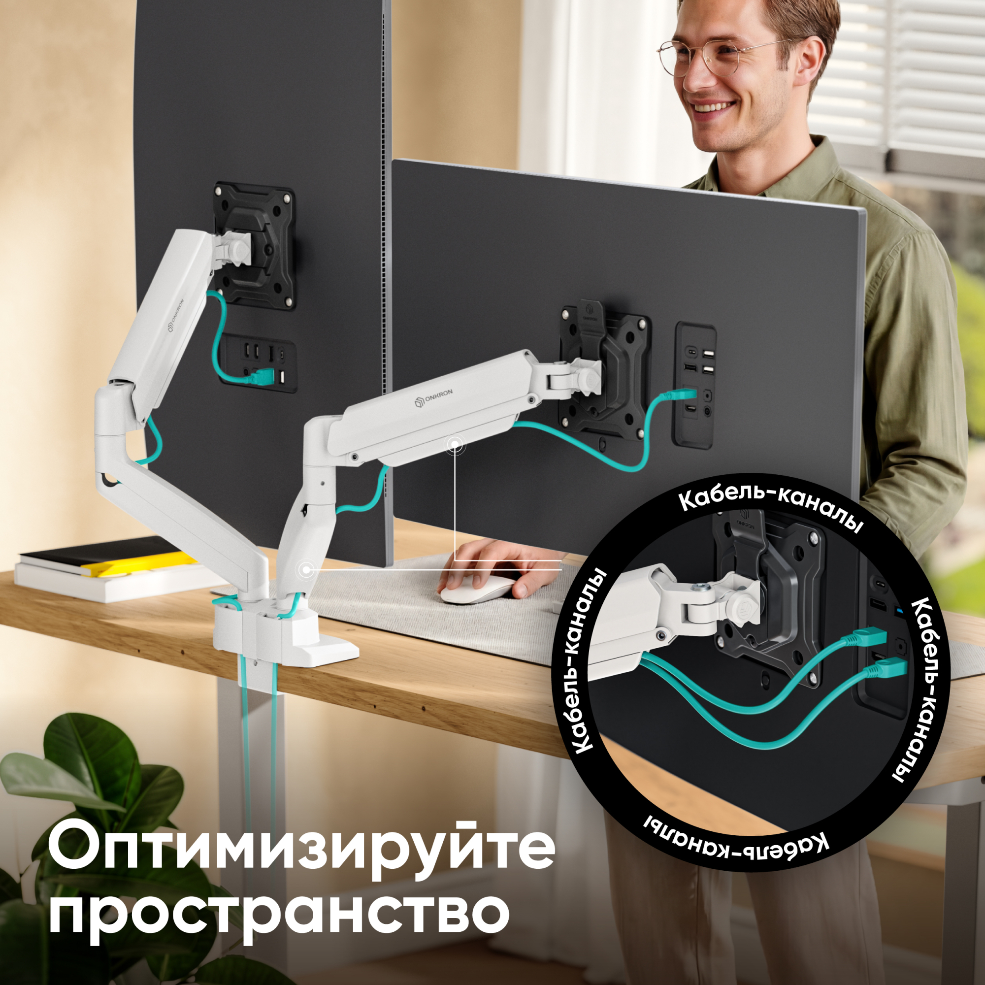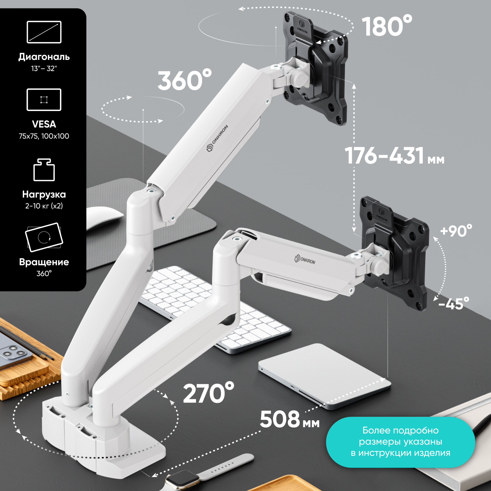 | Для двух экранов с диагональю 13"-32" Допустимая нагрузка: 2-10 кг (х2) VESA: 75x75, 100x100 мм Угол наклона: -45° ~ +90° Угол поворота: 180° Вылет от основания: 0-508 мм Вертикальное перемещение: 176-431 мм Цвет: черно-белый Портретная/альбомная ориентация экрана Установка: на краю стола, в стол Кабель-канал на защелке Материалы: сталь, алюминий, пластик Съемная Vesa |